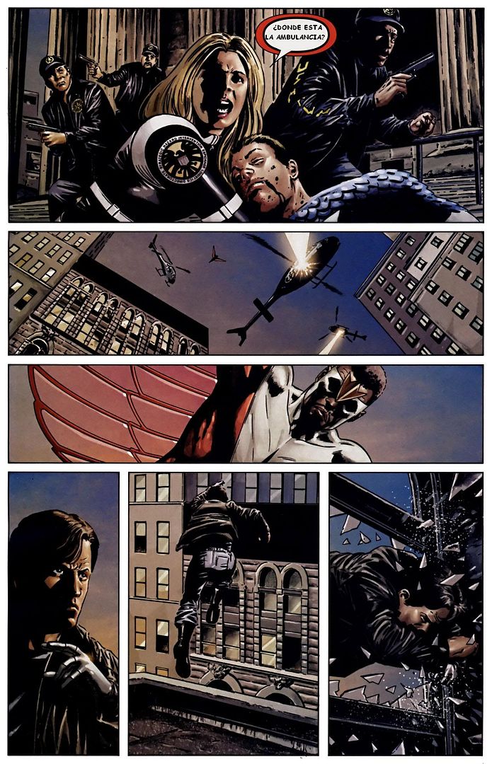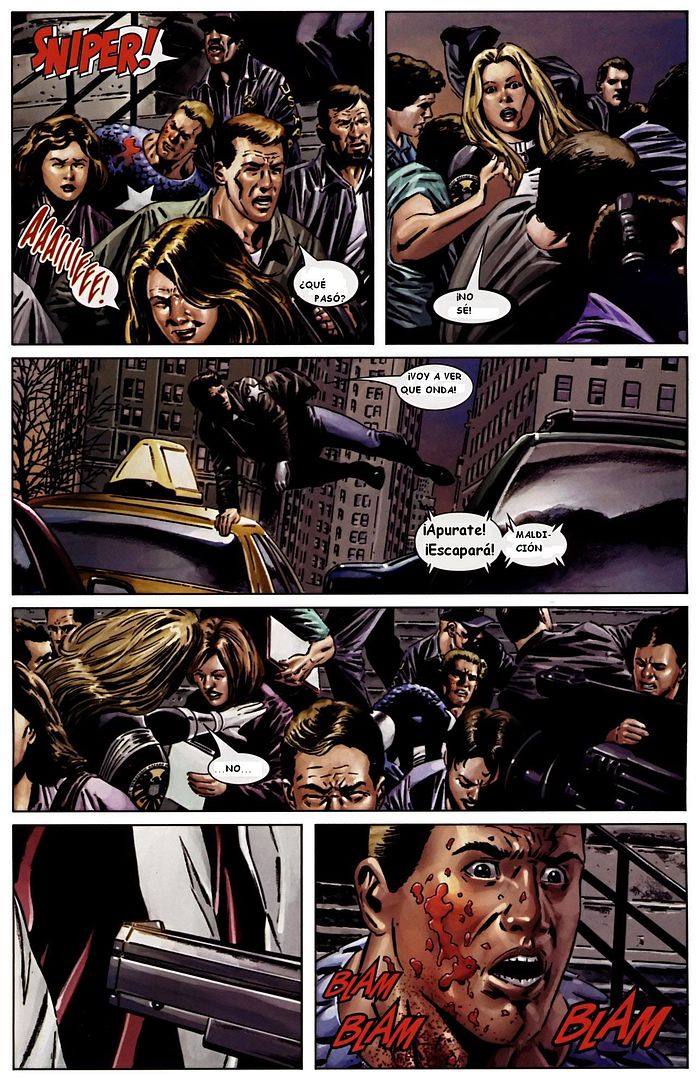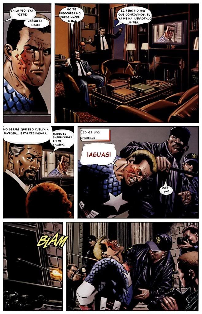 Leí el comic, al terminar, escogí mis cinco imágenes y los diálogos los escribí sin volver a checar el comic para que no tuviera tanta influencia sobre mi versión, los diálogos han sido modificados pero sigue sí sigue la historia. Utilicé lenguaje coloquial mexicano por dos razones: La primera es que el comic en está escrito en lenguaje coloquial estadounidense, haciendo uso de frases típicas como “damn it” o “to hell with it.” La segunda razón es porque yo leí Civil War en español y la traducción está hecha con un lenguaje muy neutral que a veces saca de contexto el verdadero significado de los diálogos, especialmente durante las peleas. Pues bueno, aquí va. Haz doble click sobre la imágen para verla tamaño completo.
